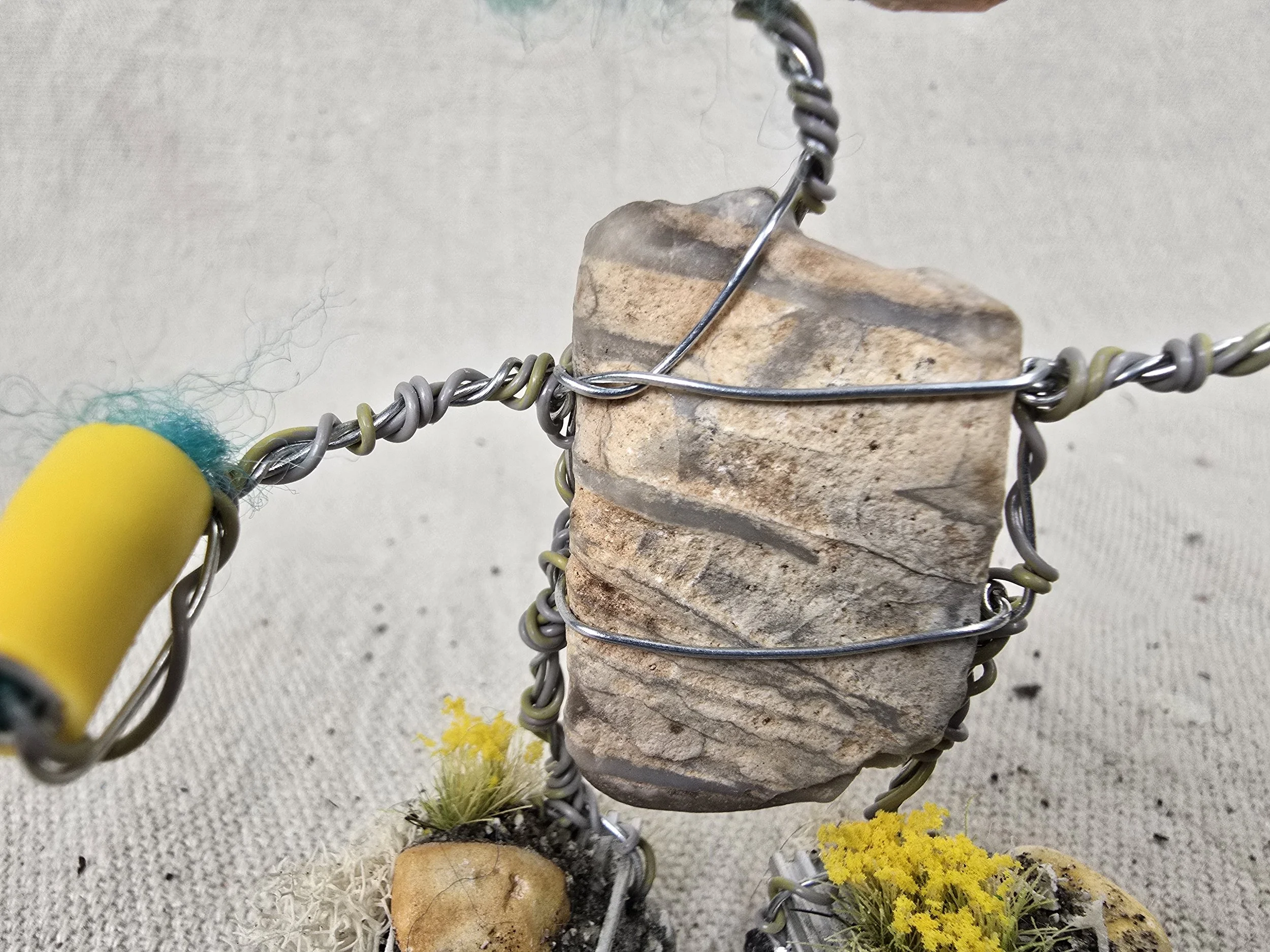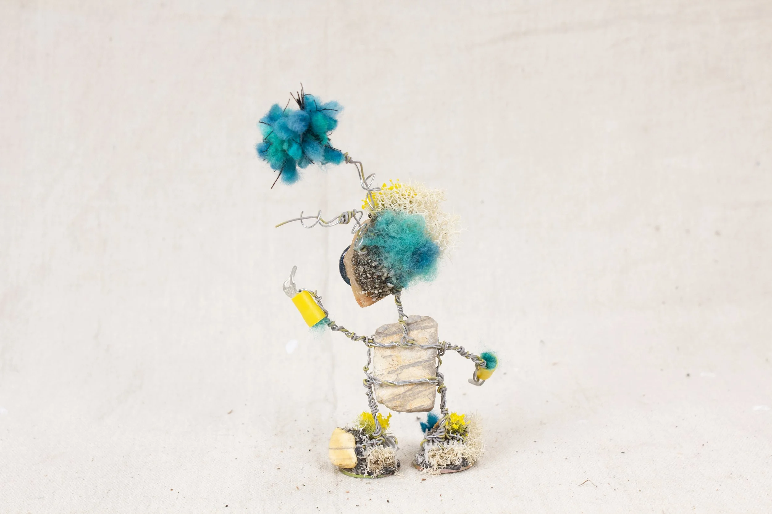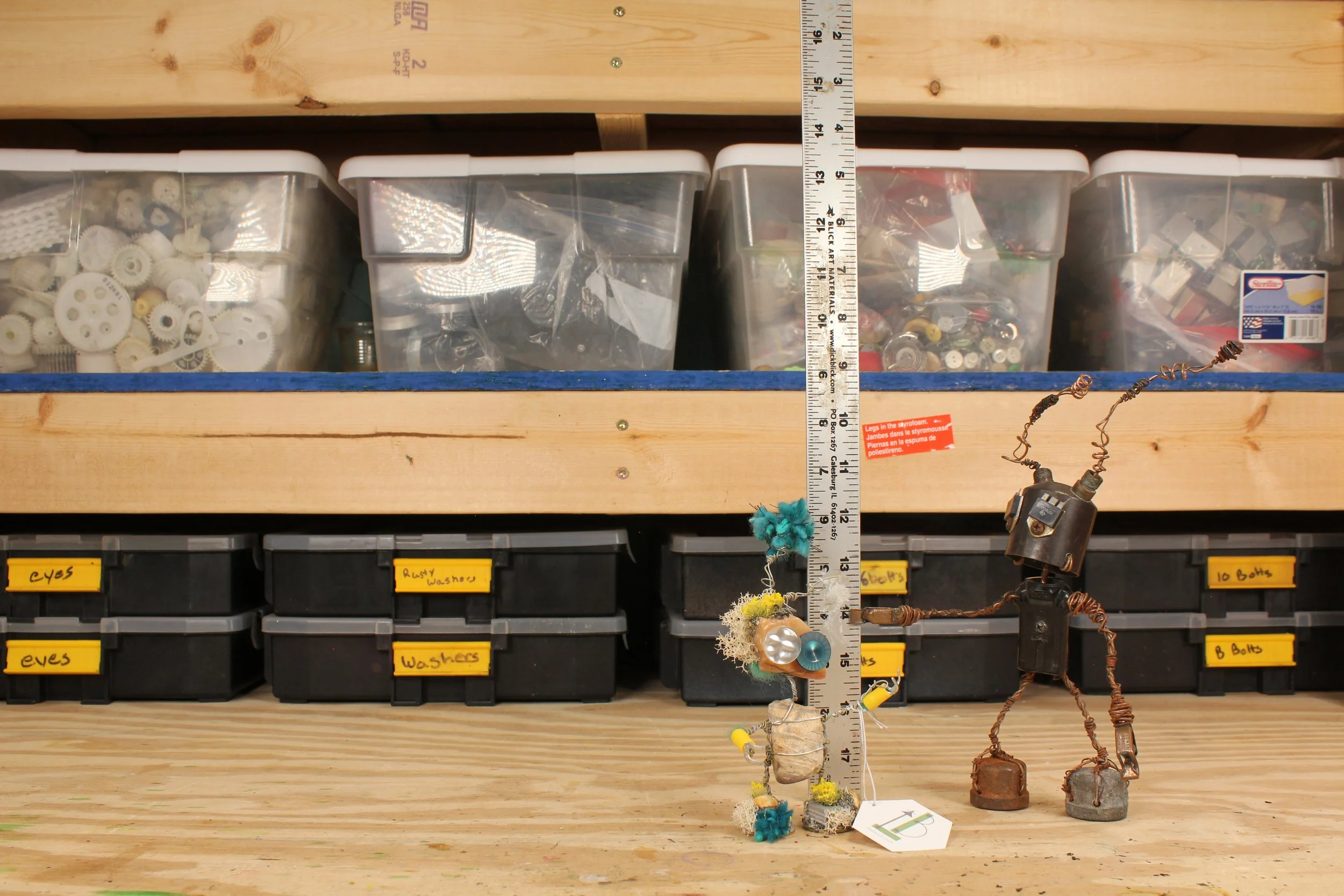 Lee Bots, are handcrafted out of old, used, and discarded parts. Many times parts from computers, printers, radios, typewriters, old crafts projects, jewelry, etc are torn apart and used. After the parts are all found and dissembled the robot is put together with wire. The wire is sewn through each of the bot's parts, connecting everything. There is a structural wire, which holds the bot up and together. This wire is bought wire, from a hardware store. The secondary wire is more decorative. This wire can be from telephone wire, networking wire, industry cables, etc that get stripped down. Most of the hands are some form of electrical clips or connectors.