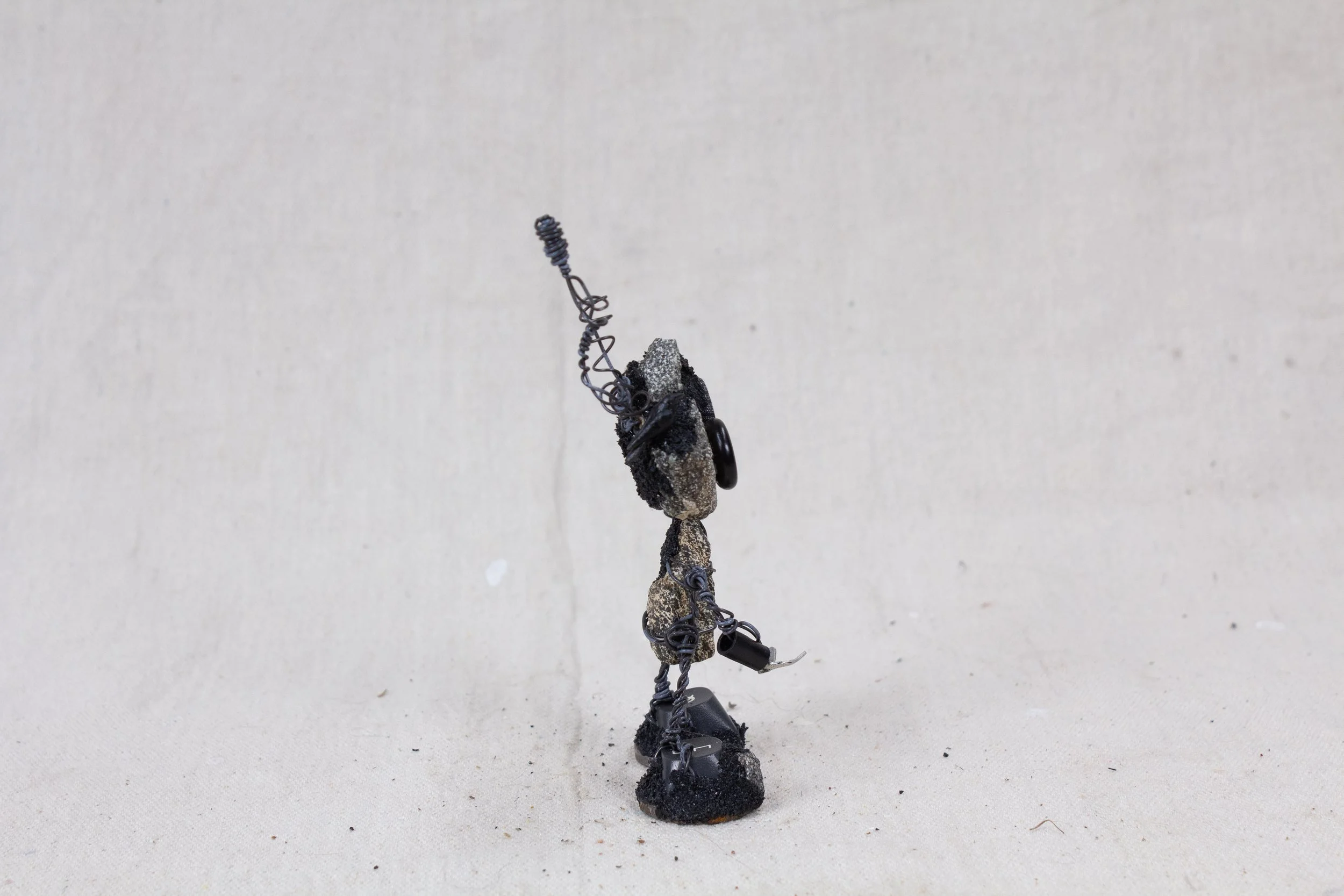Lee Bots, are handcrafted out of old, used, and discarded parts. Many times parts from computers, printers, radios, typewriters, old crafts projects, jewelry, etc are torn apart and used. After the parts are all found and dissembled the robot is put together with wire. The wire is sewn through each of the bot's parts, connecting everything. There is a structural wire, which holds the bot up and together. This wire is bought wire, from a hardware store. The secondary wire is more decorative. This wire can be from telephone wire, networking wire, industry cables, etc that get stripped down. Most of the hands are some form of electrical clips or connectors.