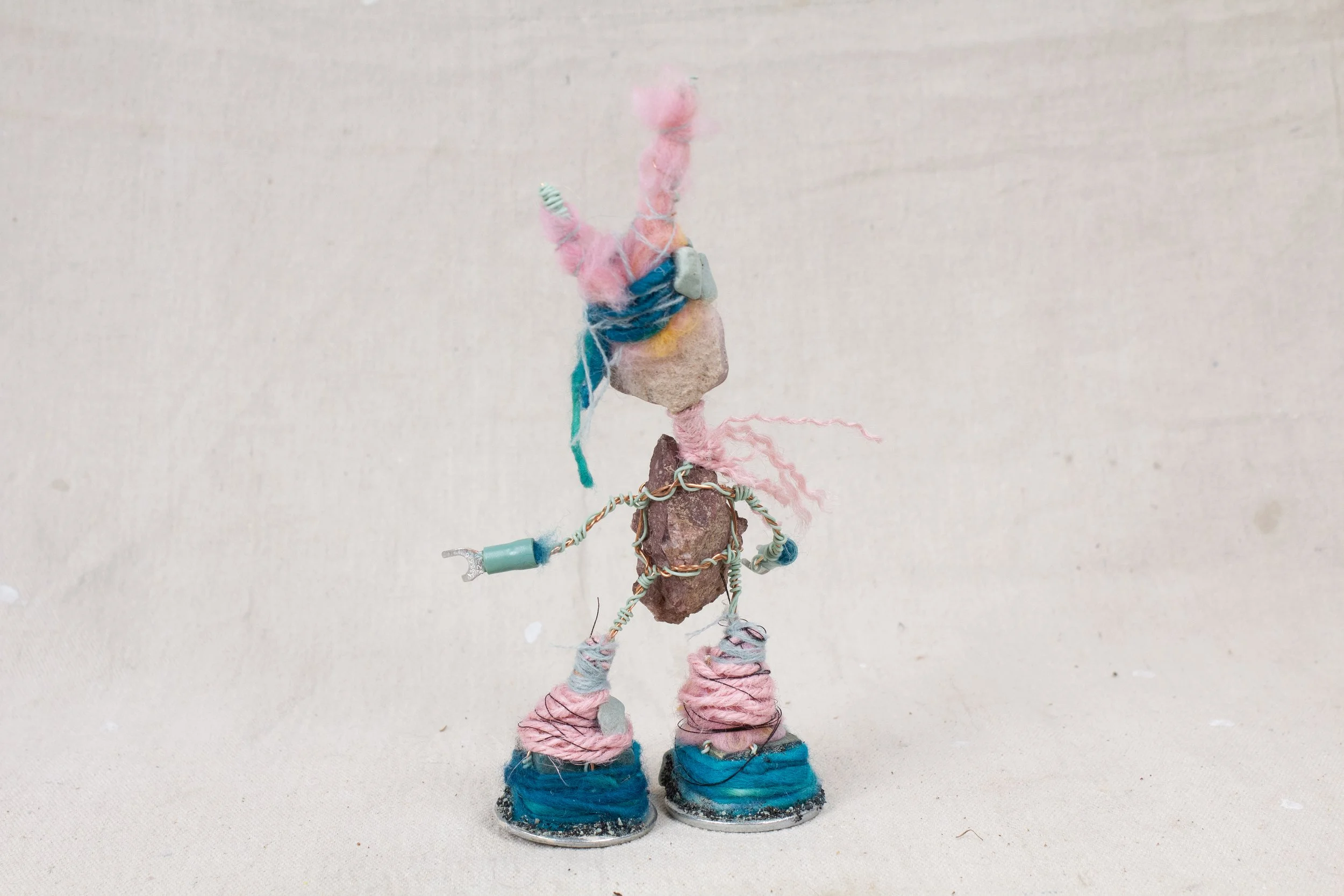 Lee Bots, are handcrafted out of old, used, and discarded parts. Many times parts from computers, printers, radios, typewriters, old crafts projects, jewelry, etc are torn apart and used. After the parts are all found and dissembled the robot is put together with wire. The wire is sewn through each of the bot's parts, connecting everything. There is a structural wire, which holds the bot up and together. This wire is bought wire, from a hardware store. The secondary wire is more decorative. This wire can be from telephone wire, networking wire, industry cables, etc that get stripped down. Most of the hands are some form of electrical clips or connectors.