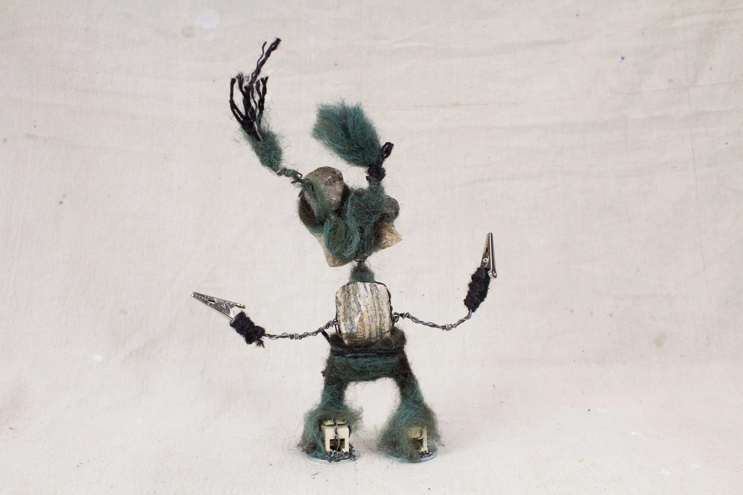 Lee Bots, are handcrafted out of old, used, and discarded parts. Many times parts from computers, printers, radios, typewriters, old crafts projects, jewelry, etc are torn apart and used. After the parts are all found and dissembled the robot is put together with wire. The wire is sewn through each of the bot's parts, connecting everything. There is a structural wire, which holds the bot up and together. This wire is bought wire, from a hardware store. The secondary wire is more decorative. This wire can be from telephone wire, networking wire, industry cables, etc that get stripped down. Most of the hands are some form of electrical clips or connectors.