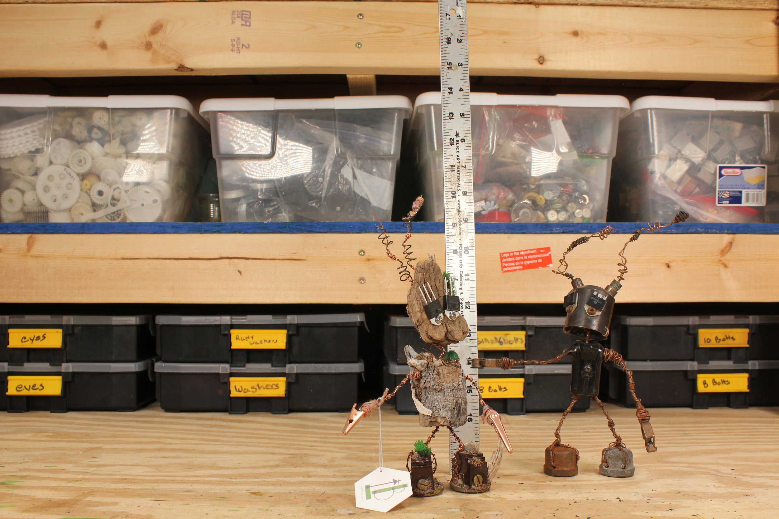 Lee Bots, are handcrafted out of old, used, and discarded parts. Many times parts from computers, printers, radios, typewriters, old crafts projects, jewelry, etc are torn apart and used. After the parts are all found and dissembled the robot is put together with wire. The wire is sewn through each of the bot's parts, connecting everything. There is a structural wire, which holds the bot up and together. This wire is bought wire, from a hardware store. The secondary wire is more decorative. This wire can be from telephone wire, networking wire, industry cables, etc that get stripped down. Most of the hands are some form of electrical clips or connectors.