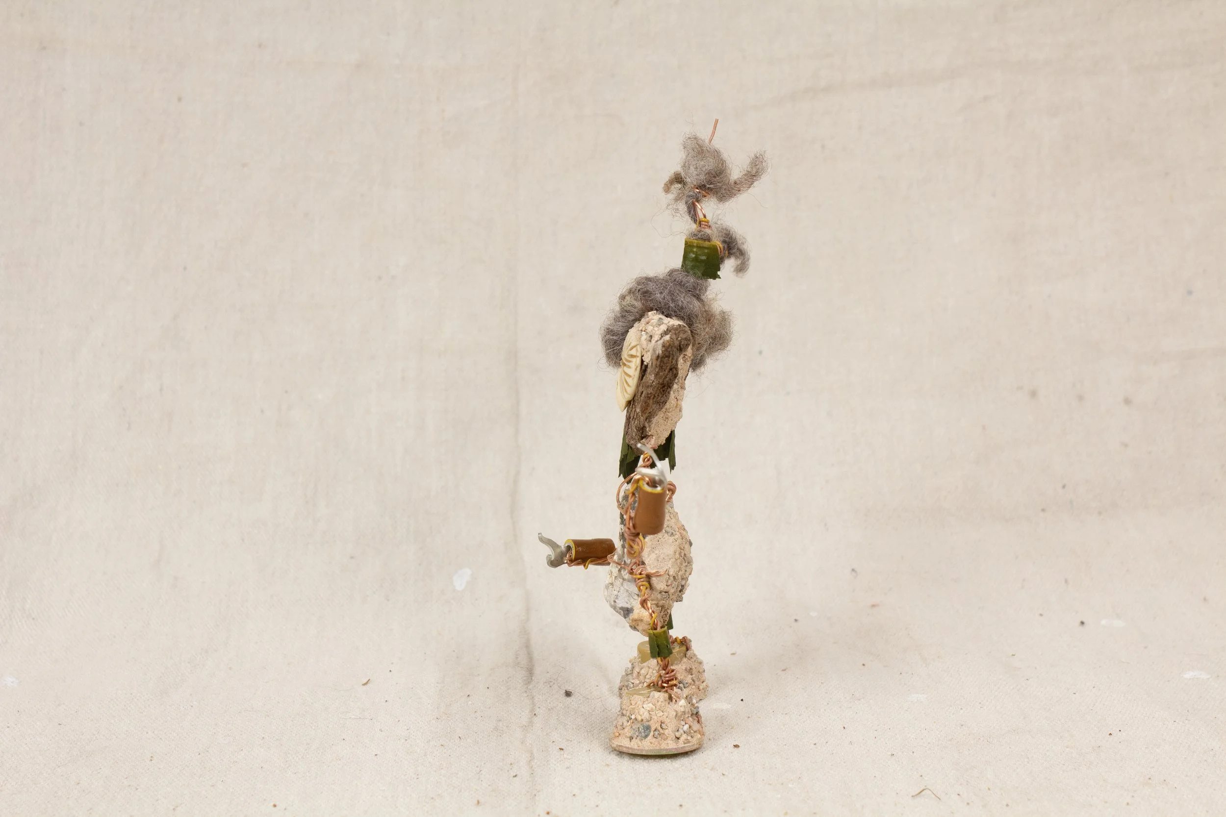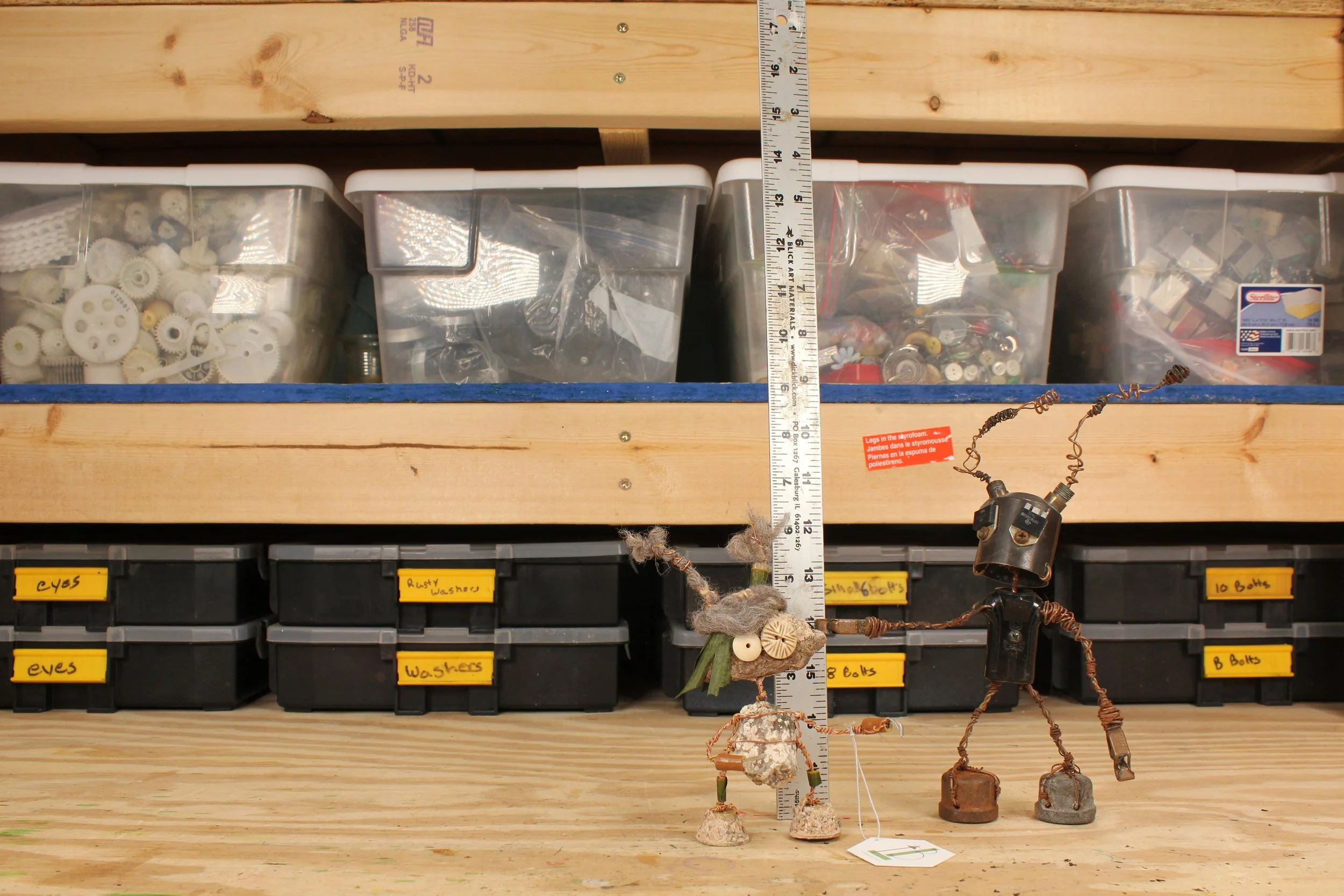 Lee Bots, are handcrafted out of old, used, and discarded parts. Many times parts from computers, printers, radios, typewriters, old crafts projects, jewelry, etc are torn apart and used. After the parts are all found and dissembled the robot is put together with wire. The wire is sewn through each of the bot's parts, connecting everything. There is a structural wire, which holds the bot up and together. This wire is bought wire, from a hardware store. The secondary wire is more decorative. This wire can be from telephone wire, networking wire, industry cables, etc that get stripped down. Most of the hands are some form of electrical clips or connectors.