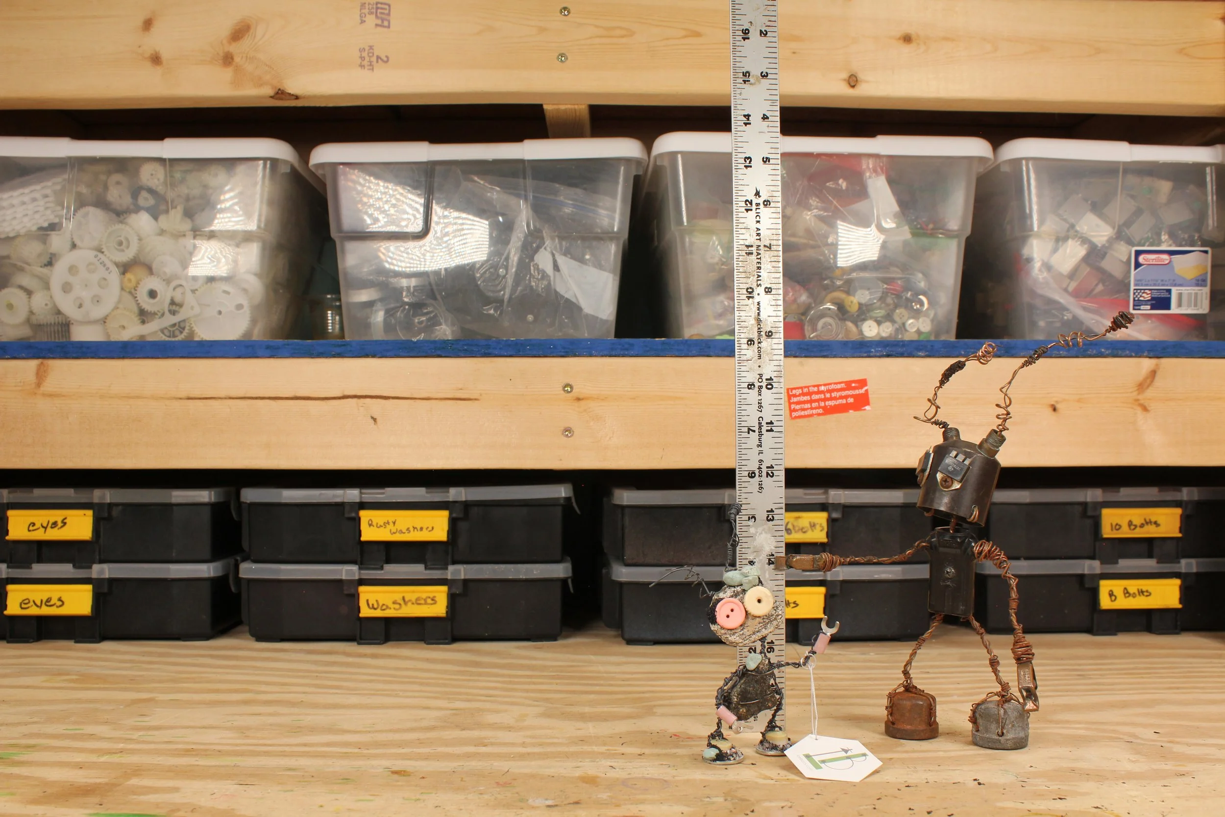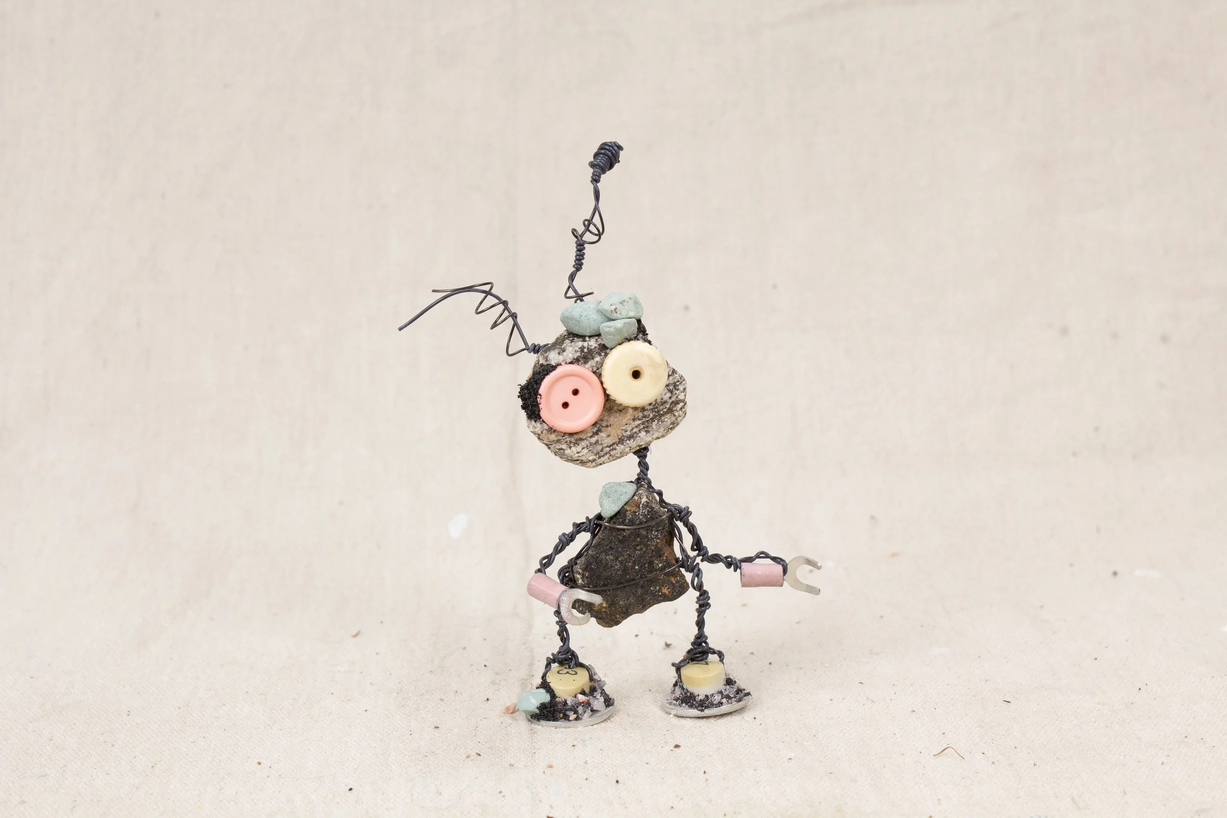 Lee Bots, are handcrafted out of old, used, and discarded parts. Many times parts from computers, printers, radios, typewriters, old crafts projects, jewelry, etc are torn apart and used. After the parts are all found and dissembled the robot is put together with wire. The wire is sewn through each of the bot's parts, connecting everything. There is a structural wire, which holds the bot up and together. This wire is bought wire, from a hardware store. The secondary wire is more decorative. This wire can be from telephone wire, networking wire, industry cables, etc that get stripped down. Most of the hands are some form of electrical clips or connectors.