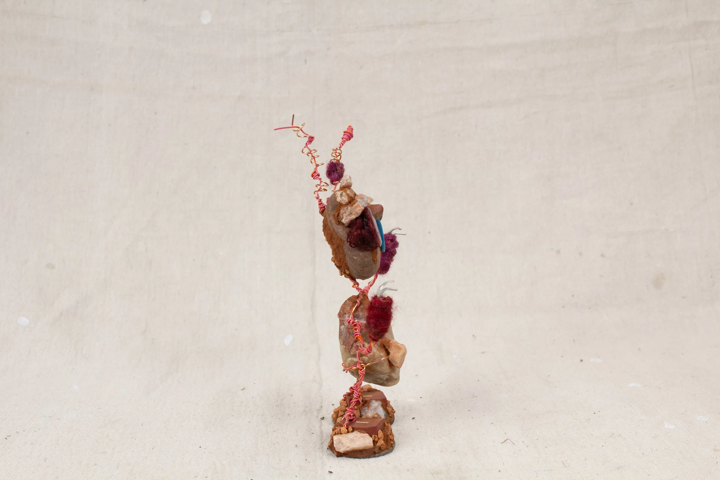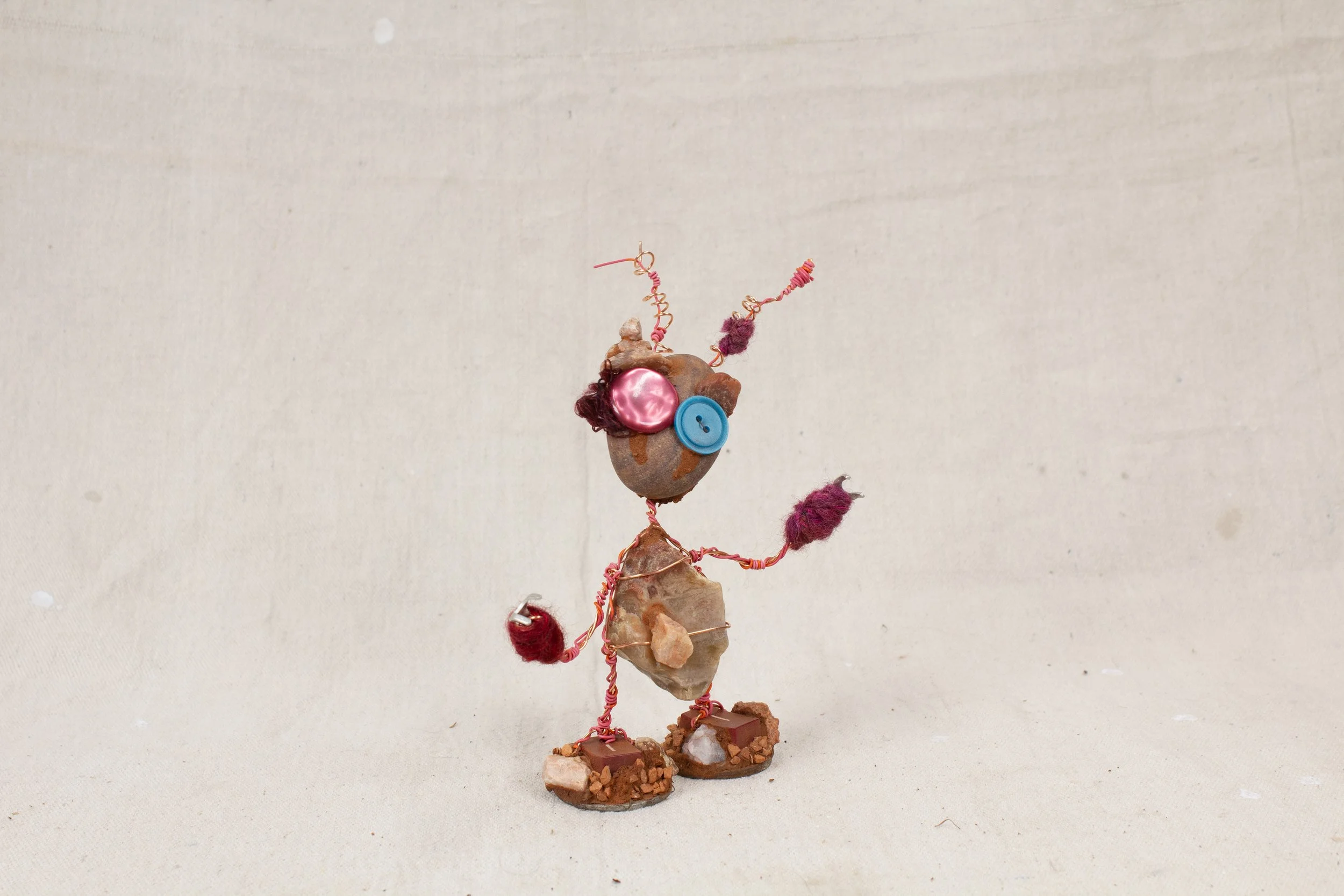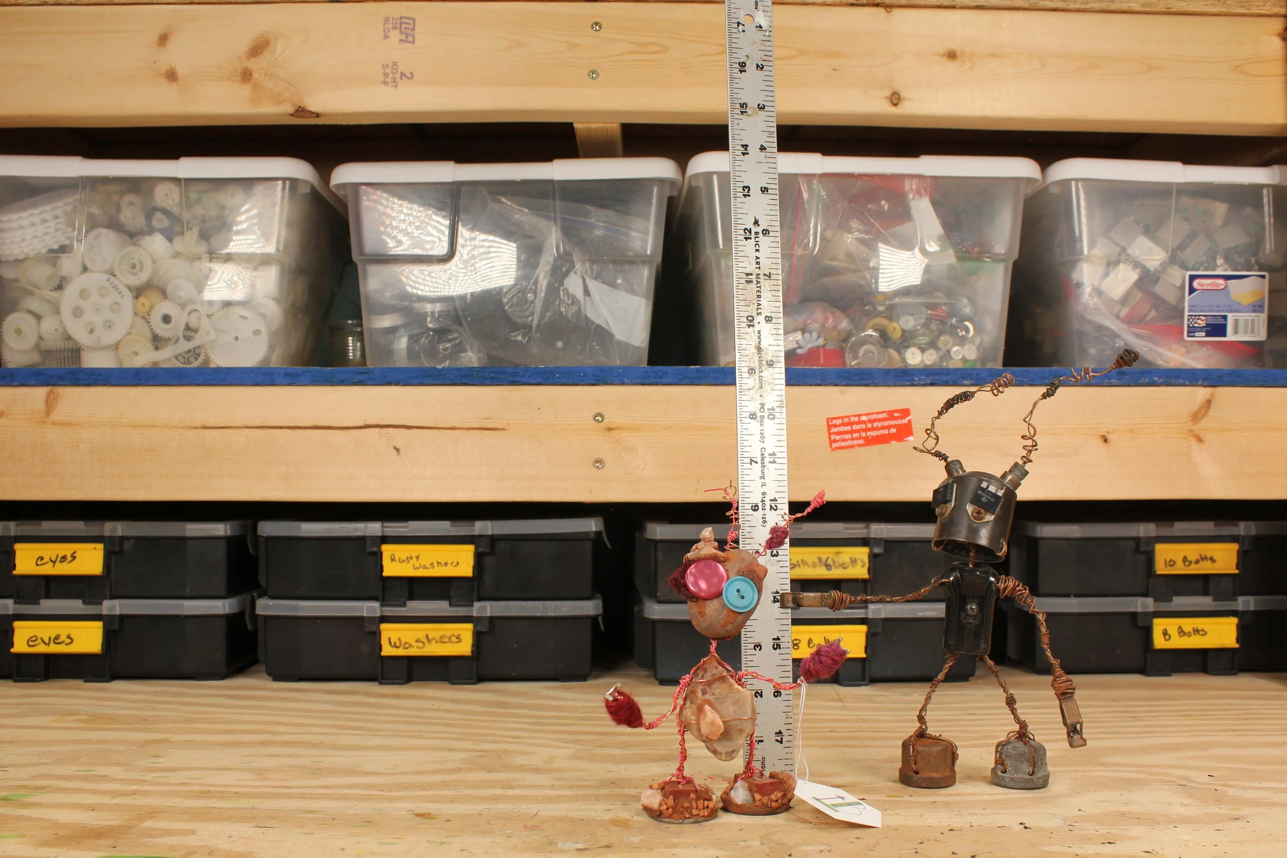 Lee Bots, are handcrafted out of old, used, and discarded parts. Many times parts from computers, printers, radios, typewriters, old crafts projects, jewelry, etc are torn apart and used. After the parts are all found and dissembled the robot is put together with wire. The wire is sewn through each of the bot's parts, connecting everything. There is a structural wire, which holds the bot up and together. This wire is bought wire, from a hardware store. The secondary wire is more decorative. This wire can be from telephone wire, networking wire, industry cables, etc that get stripped down. Most of the hands are some form of electrical clips or connectors.