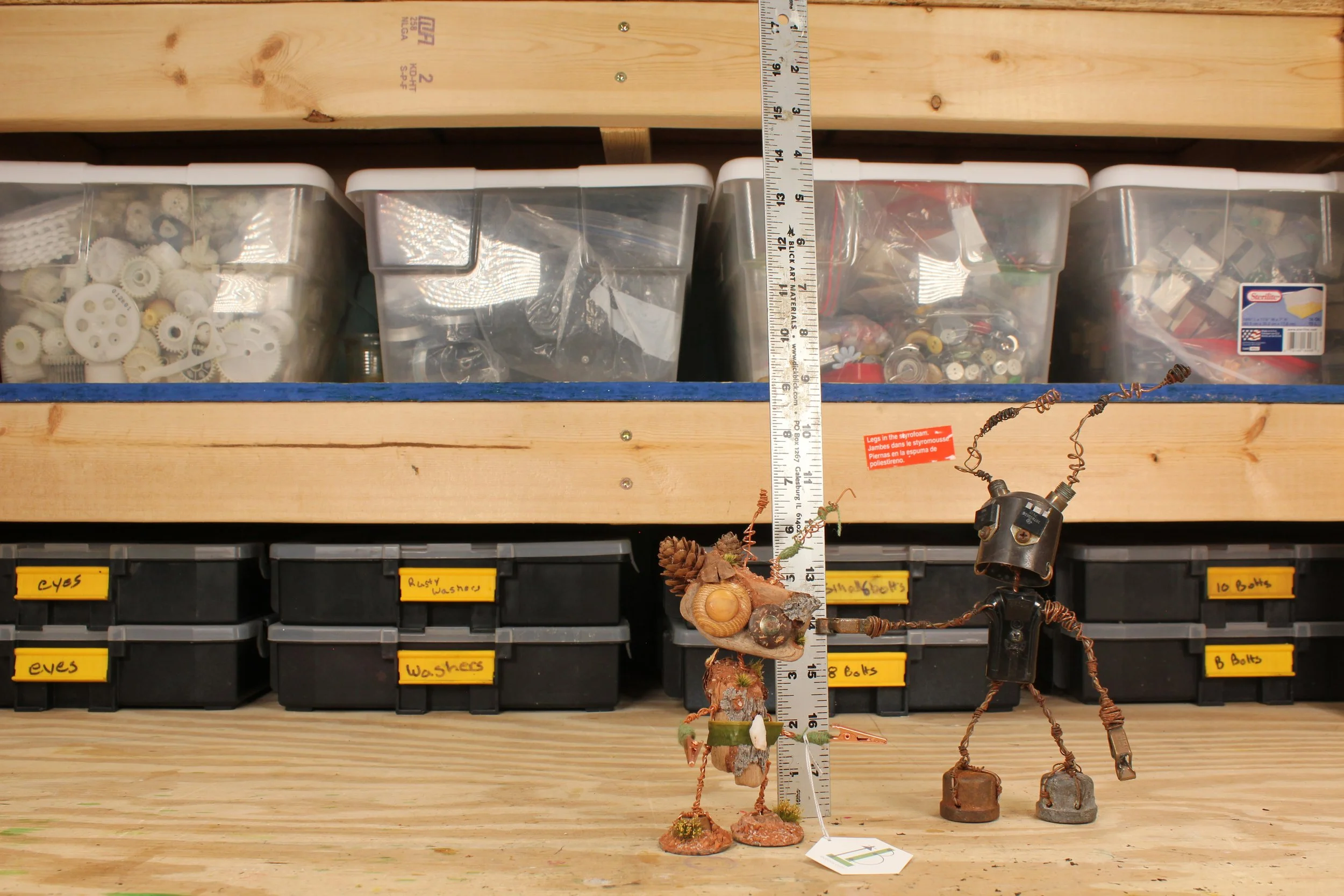 Lee Bots, are handcrafted out of old, used, and discarded parts. Many times parts from computers, printers, radios, typewriters, old crafts projects, jewelry, etc are torn apart and used. After the parts are all found and dissembled the robot is put together with wire. The wire is sewn through each of the bot's parts, connecting everything. There is a structural wire, which holds the bot up and together. This wire is bought wire, from a hardware store. The secondary wire is more decorative. This wire can be from telephone wire, networking wire, industry cables, etc that get stripped down. Most of the hands are some form of electrical clips or connectors.