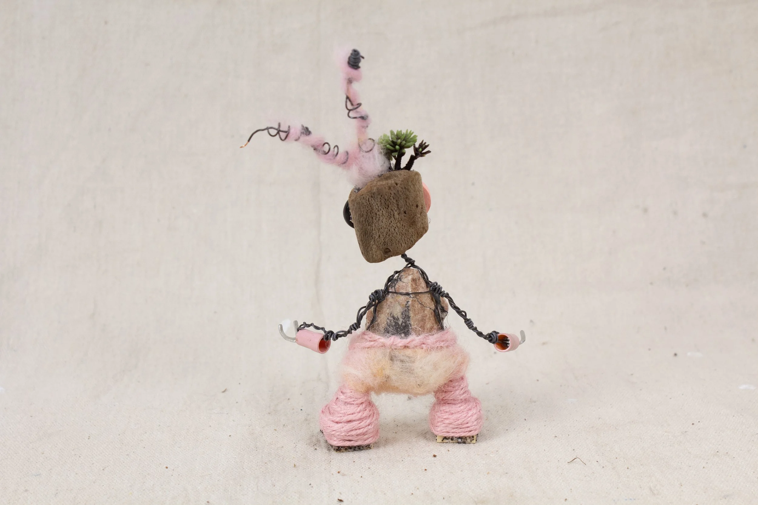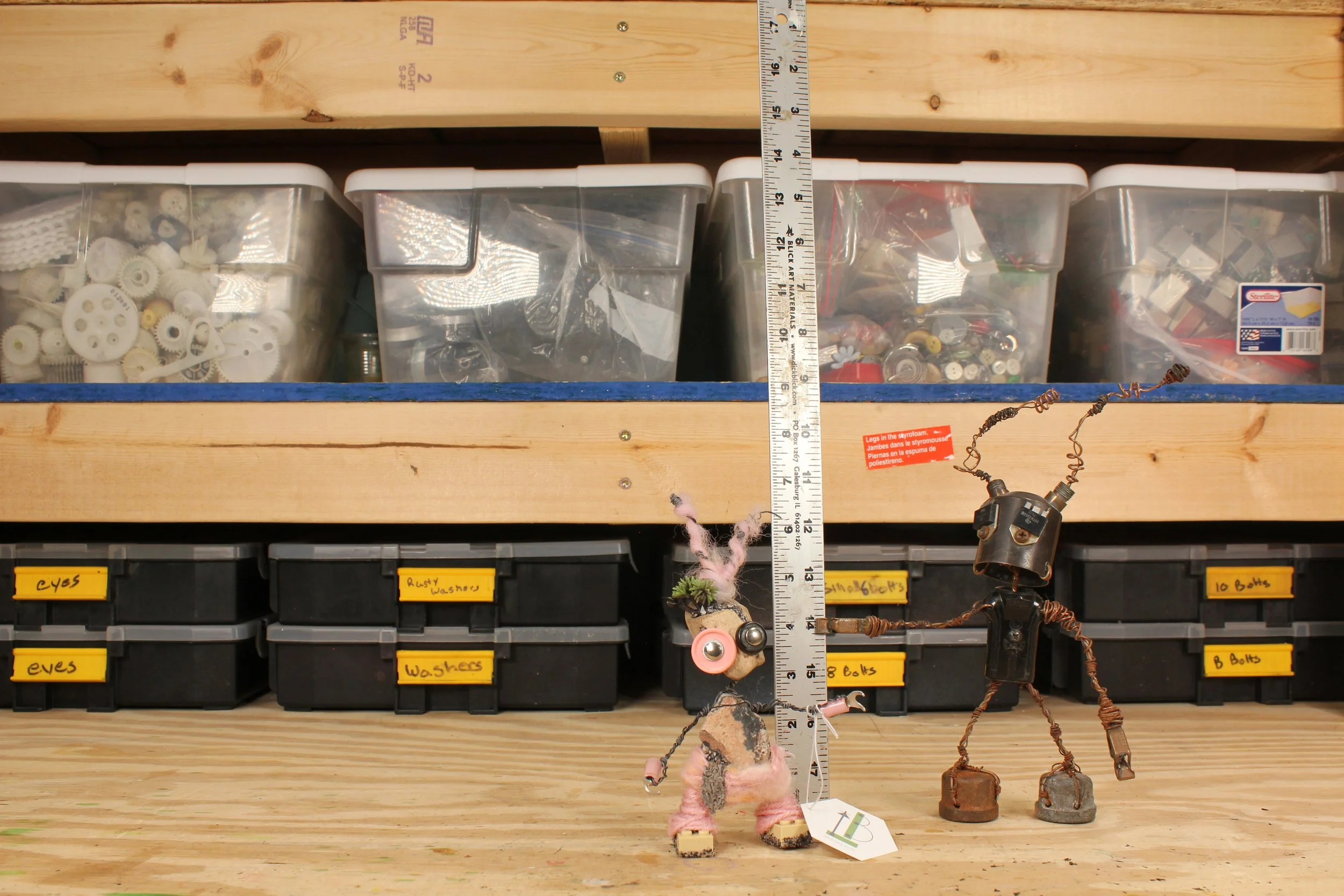 Lee Bots, are handcrafted out of old, used, and discarded parts. Many times parts from computers, printers, radios, typewriters, old crafts projects, jewelry, etc are torn apart and used. After the parts are all found and dissembled the robot is put together with wire. The wire is sewn through each of the bot's parts, connecting everything. There is a structural wire, which holds the bot up and together. This wire is bought wire, from a hardware store. The secondary wire is more decorative. This wire can be from telephone wire, networking wire, industry cables, etc that get stripped down. Most of the hands are some form of electrical clips or connectors.